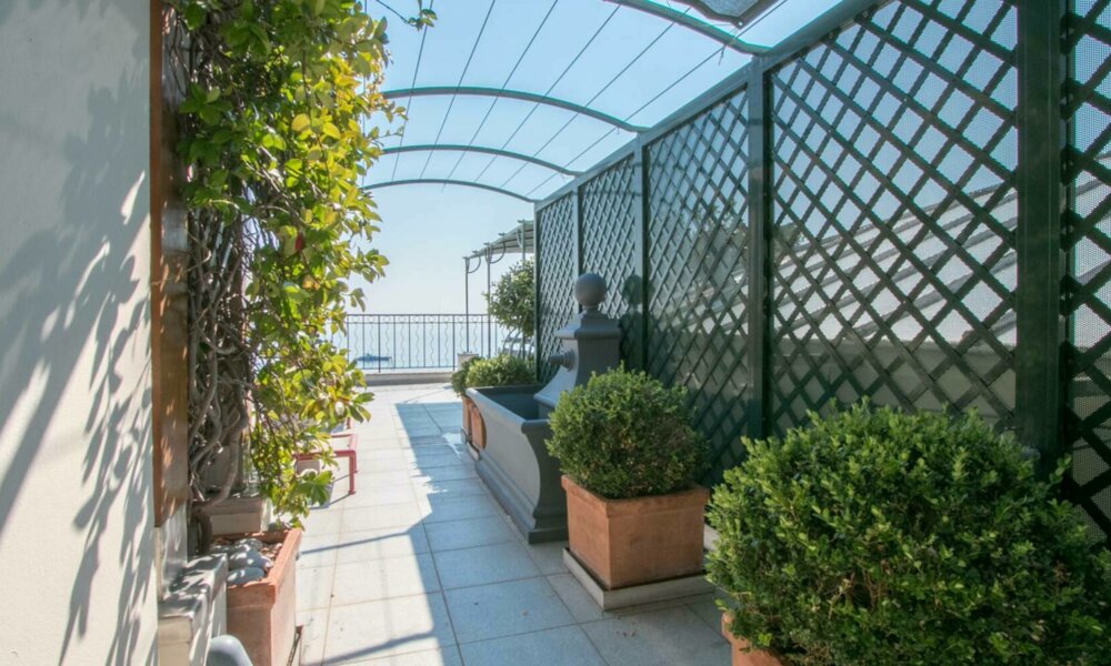 Des escaliers privatifs permettent d’accéder à la terrasse sur le toit avec une cuisine d’été, et à une grande terrasse de 140 m2 offrant une superbe vue panoramique sur la mer.